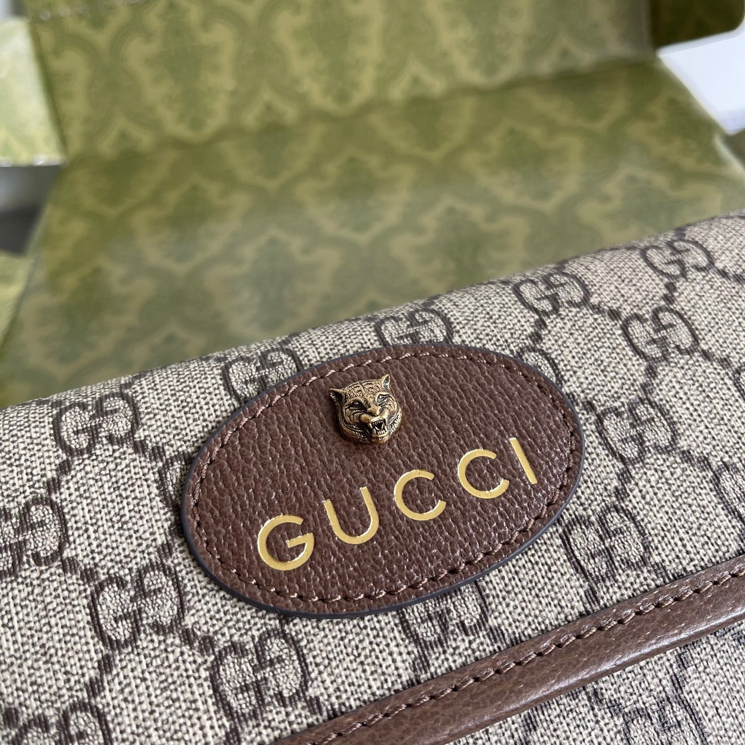 - Oval Gucci leather tag with feline head