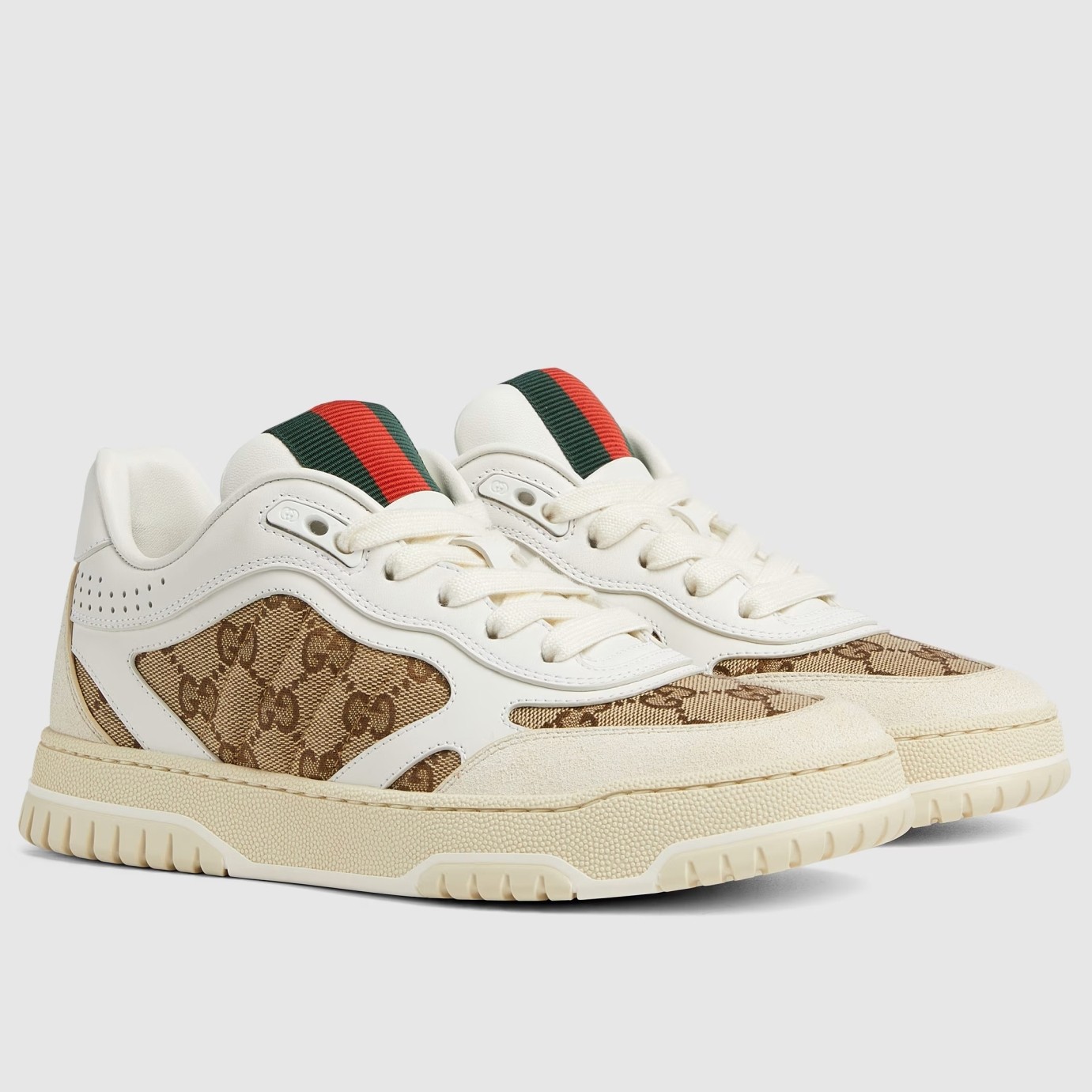 The first footwear silhouette envisioned by Sabato De Sarno for the House of Gucci, the Re-Web sneakers provide an intriguing insight into his detail-oriented approach. Taking a renewed, subtle approach to the brand's iconic webbing, four tonal stripes of stitching detail the panelled Original GG canvas, while the green and red hues feature on the tongue. Style this chunky sneaker with the brand's jeans for an off-duty statement.