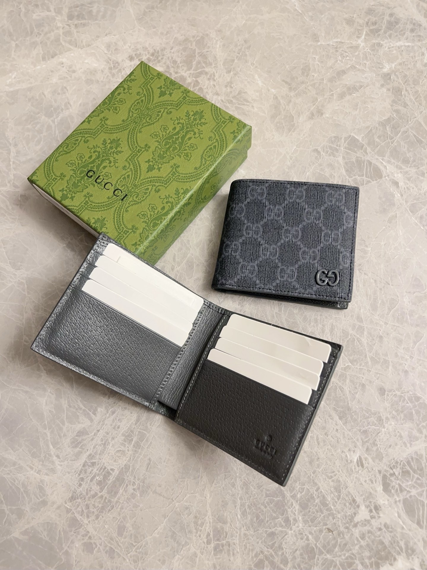 Slim and compact small leather goods from the latest collections highlight new colorful shades sporting the GG logo with a bicolor design. This wallet with eight card slots appears in a black GG Supreme canvas, complete with a smooth grey leather interior.