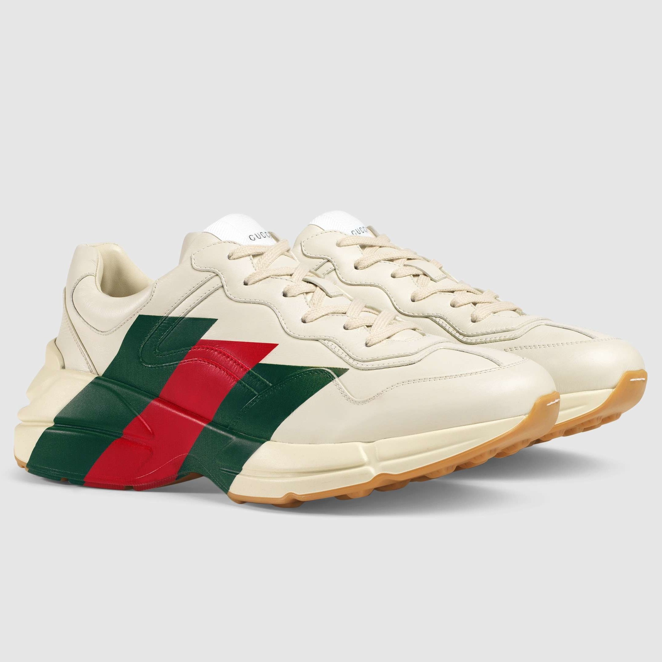 Lend statement athleisure to your off-duty rotations with the Rython sneakers by Gucci. Featuring bold Web stripe detailing from the upper to the sole, the pairis imbued with the label's signature branding for head-turning appeal. Sat atop a chunky tiered sole, they play into the coveted \'Dad sneaker\' trend this season for an alternative take on casualwear.