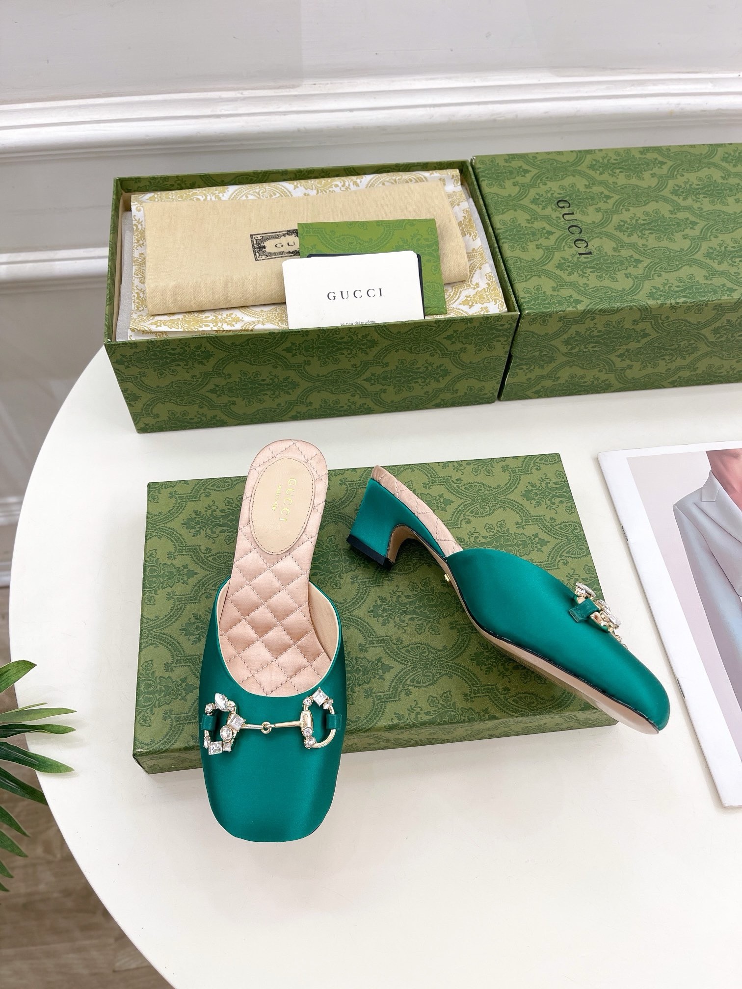 Gucci's mules are topped with a glamorous version of the signature horsebit, which is encrusted with sparkling crystals and resembles jewelry. They've been crafted from lustrous satin and have quilted linings and sculptural kitten heels.